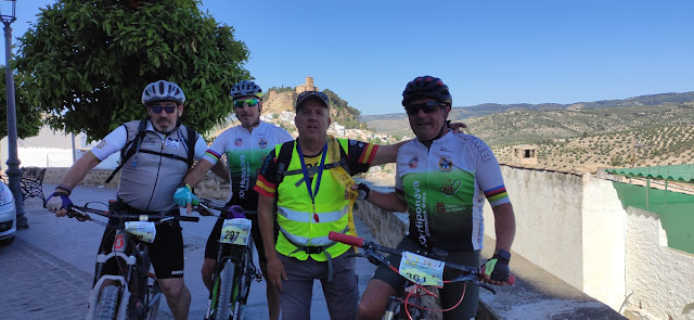 Y todo queda listo para el esperado día que empieza con un fenomenal madrugón para montar la infraestructura de vallas, barras de bicis, arcos, carpas, pancartas... Recepción de corredores y entrega de sus bolsas. Firma de documentos. Entrega de la torta malena, nuestra especial barrita energética. Voluntarios y corredores para arriba y abajo. Cargar los medios de transporte para el avituallamiento en Montefrío; fruta, frutos secos, chucherías,... Ultimas instrucciones y despliegue del grupo de voluntarios y miembros de la Peña de MTB Los Pinares y de Protección Civil por todo el recorrido. Discursos de salida, momentos de recomendaciones y emotivos recuerdos. Salida neutralizada del pelotón que hace sus primeros metros escoltados por la Policía Municipal a golpe de sirena por las calles del pueblo, despertando a los vecinos que asombrados y medio adormilados, se asoman a los balcones para contemplar el llamativo espectáculo multicolor del compacto pelotón. Casi sin darnos cuenta, se llega hasta el Llano del Arco, la puerta de Los Pinares, en donde comienza la aventura de verdad. Nervios a flor de piel, un nudo en la boca del estómago y un único e intenso pensamiento-deseo: "¡Que todo salga bien! ¡Que no pase nada!"